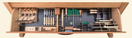 Conjunto de ferramentas de 37 peças 304 no compartimento extraível da bancada de trabalho (compartimento não incluído).