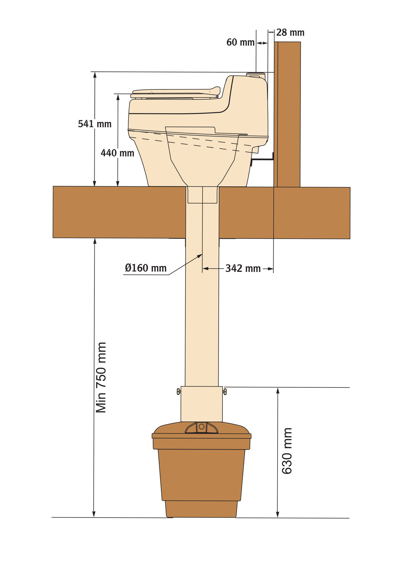 Com o kit de acessórios, mantém os resíduos fora das propriedades. O contentor é fácil de montar no espaço diretamente debaixo da sanita. Note-se que o espaço precisa de ser acessível do exterior para esvaziamento.