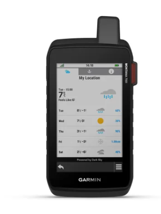 O serviço de previsão meteorológica inReach disponível fornece atualizações detalhadas diretamente para o dispositivo portátil Montana ou dispositivos emparelhados, para que saiba o que esperar na rota.
