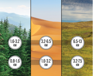 O alcance varia consoante o terreno e outras limitações da linha de visão. Eis alguns exemplos de desempenho normal: