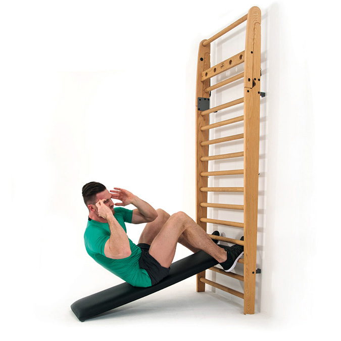 Madeira maciça, cordões de segurança mais fortes para a barra rebatível e peças adicionais de fixação à parede tornam as WallBars uma peça segura e resistente de equipamento de exercício multi-funcional.